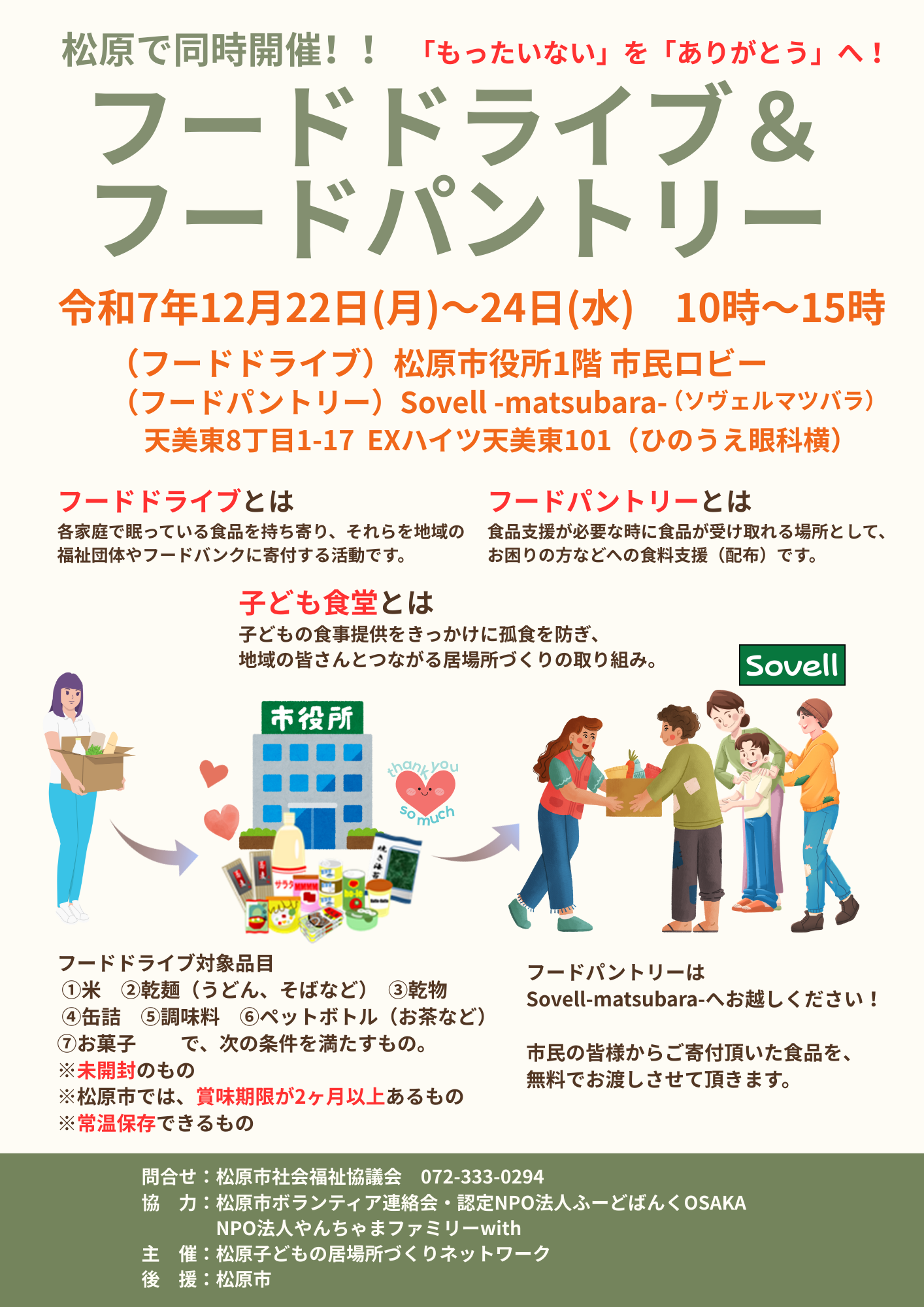 食品ロスの削減や、子どもだけで食事をすることを解消し、地域交流の場となる子ども食堂などへの支援を目的に、市役所 市民ロビーにてフードドライブ活動を行います。またご寄付いただいた食品を配布するフードパントリーも、Sovell-matsubara-(ソヴェル マツバラ)にて同時開催します。